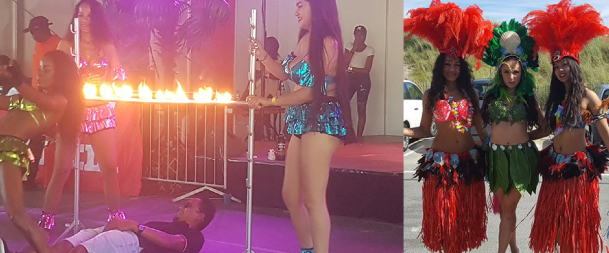 Bezetting: dans (2 mooie tropische danseressen), muziek (swingend duo) of tropische DJ naar keuze.